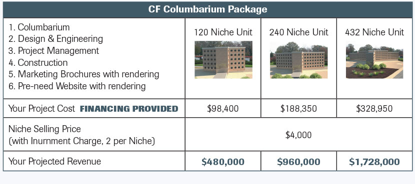 This example illustrates our full-service columbarium package pricing and your profit potential for 120, 240 and 432 niche units.